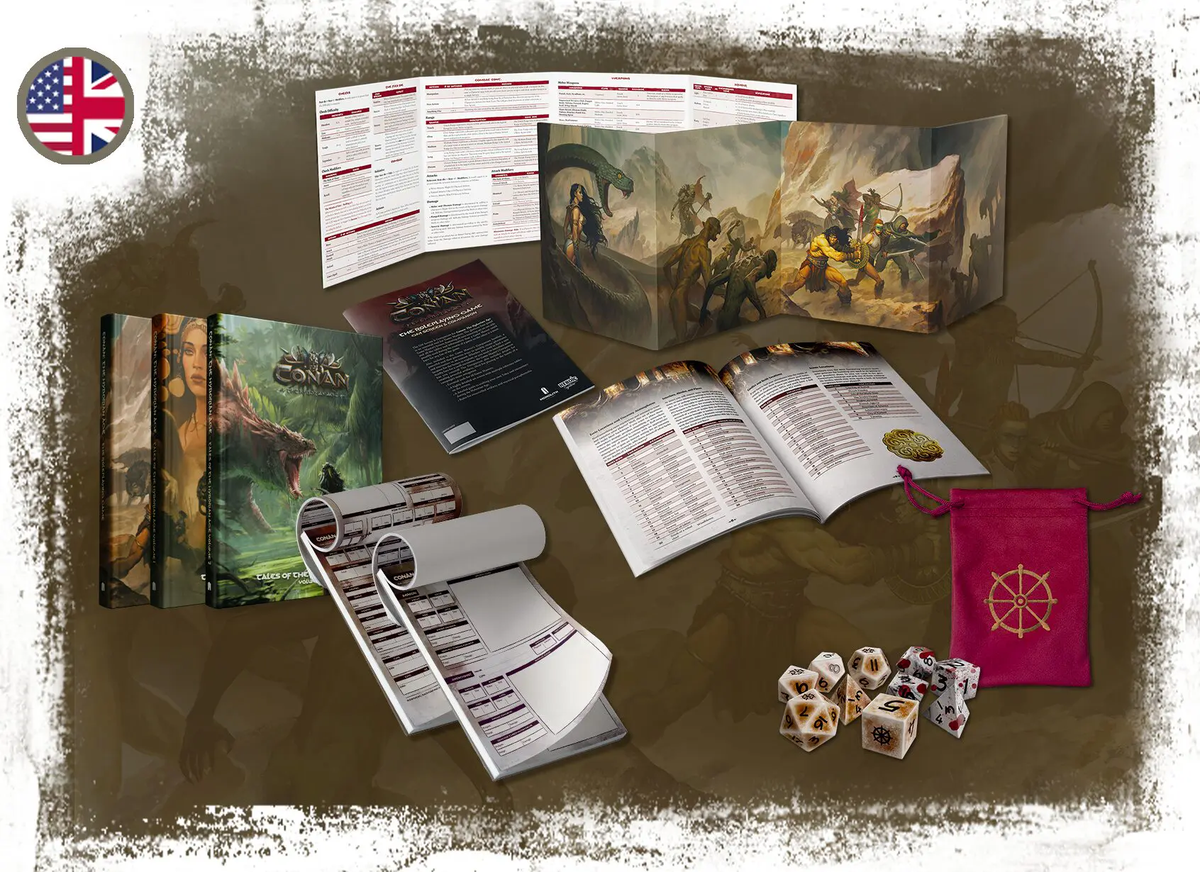 The “Adventurer Pledge” edition of Conan: The Hyborian Age gives you everything you need to start playing immediately: the core rulebook, character and encounter pads, custom dice, and two volumes of tales.