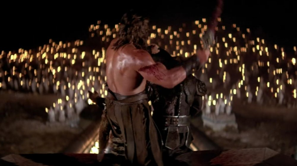 The film shows Conan “visibly contemplating” these words, and that hesitation contains multitudes. Two philosophies war across his features. Accept Doom’s claim and become the perfected weapon of another’s will–the flesh made strong through submission.