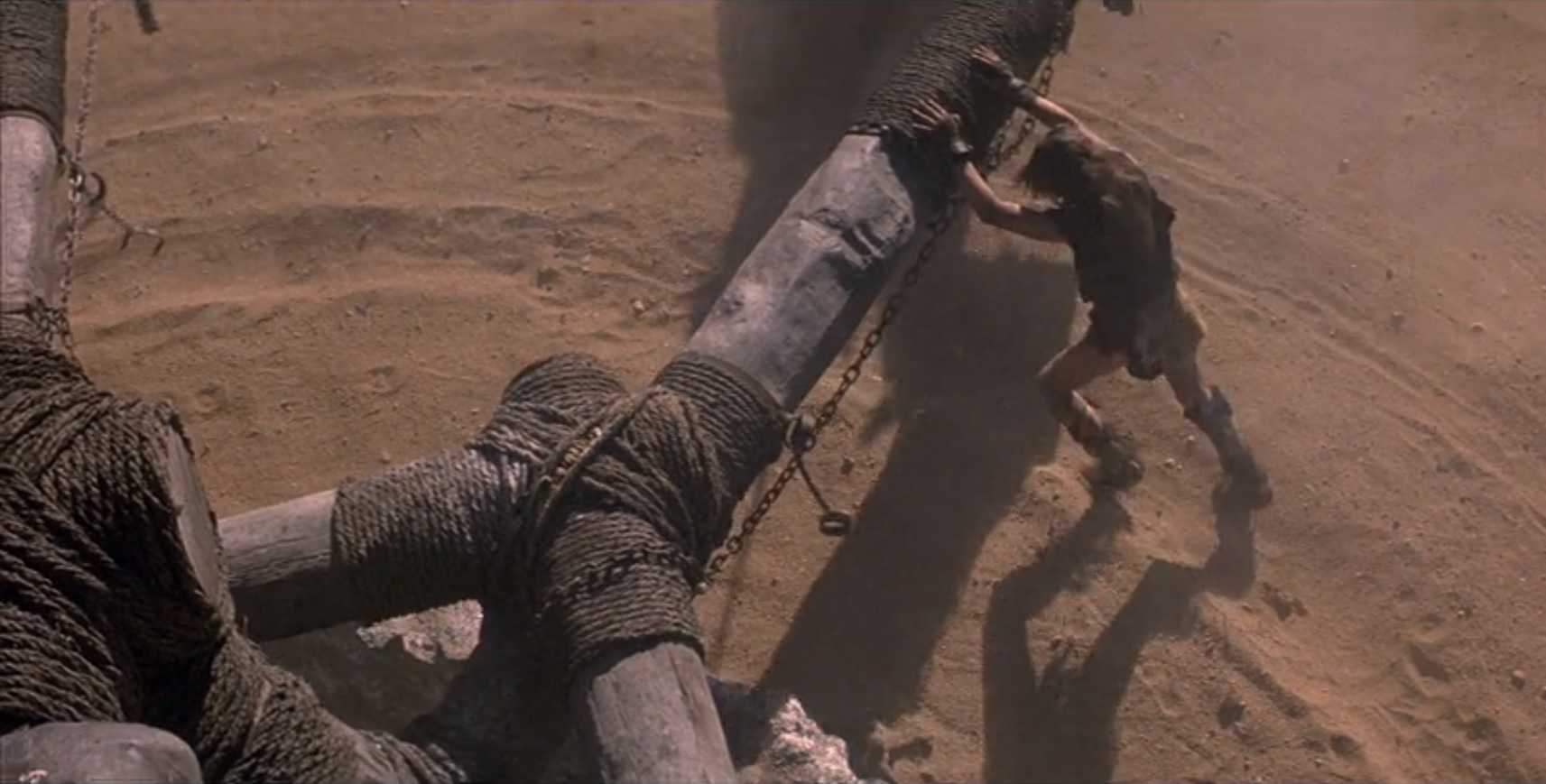 The sequence deliberately evokes the Greek myth of Sisyphus. Milius intended this “allegory” for humanity’s “universal human struggle” and “fruitless toil of life.” Children push, they circle, they die. Most collapse within months. Some last years before breaking. One survives decade after decade until survival itself transforms into something unprecedented. This “brutal apprenticeship…toughens and ‘re-creates’ Conan’s very being. His identity becomes “forged on this wheel just as surely as the steel of his father’s sword was forged in fire.”
