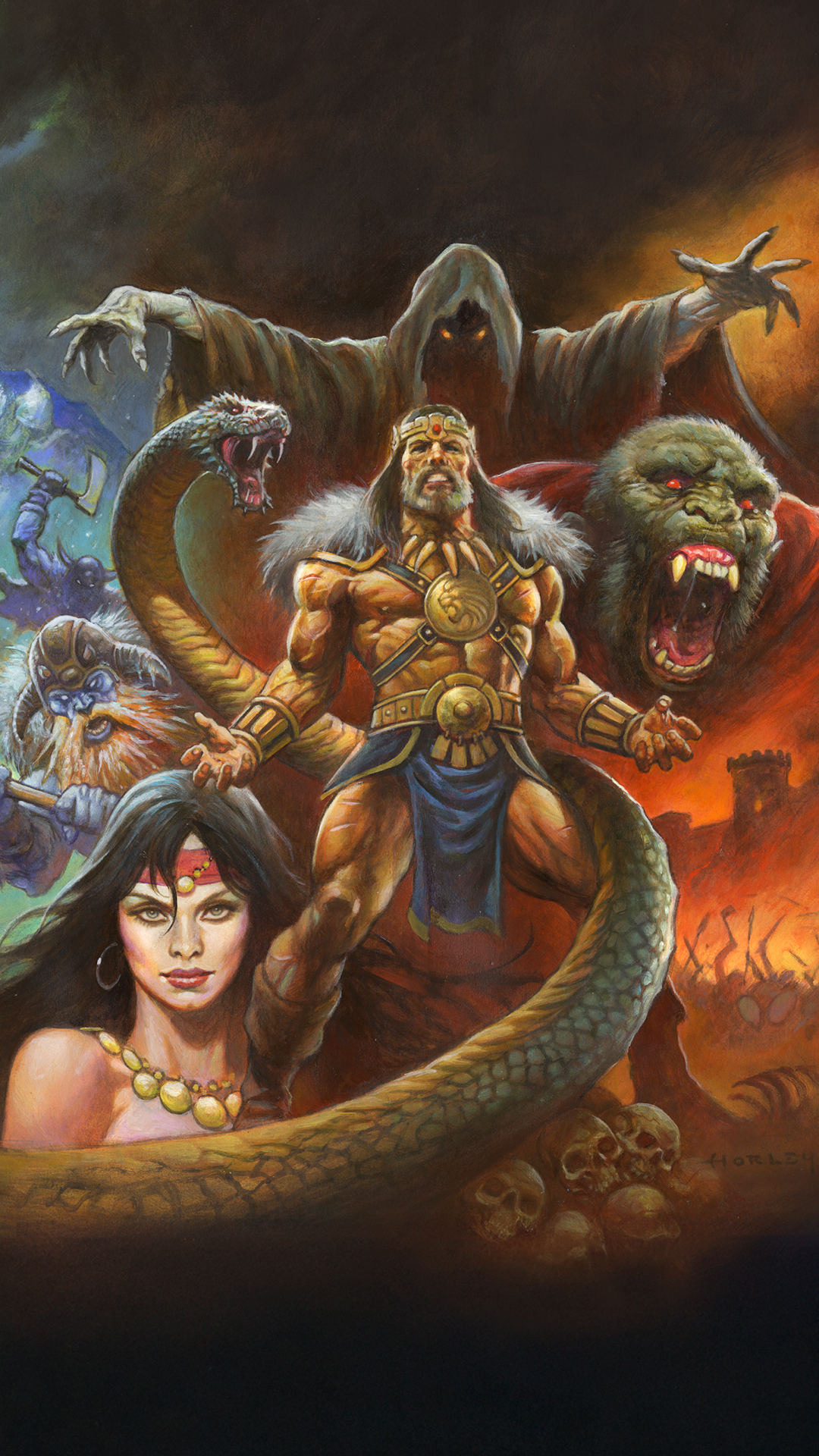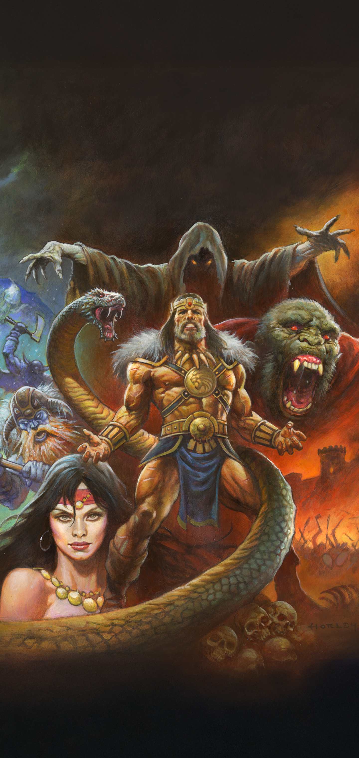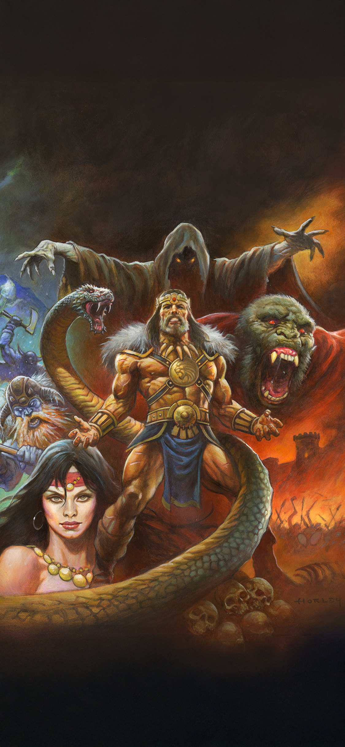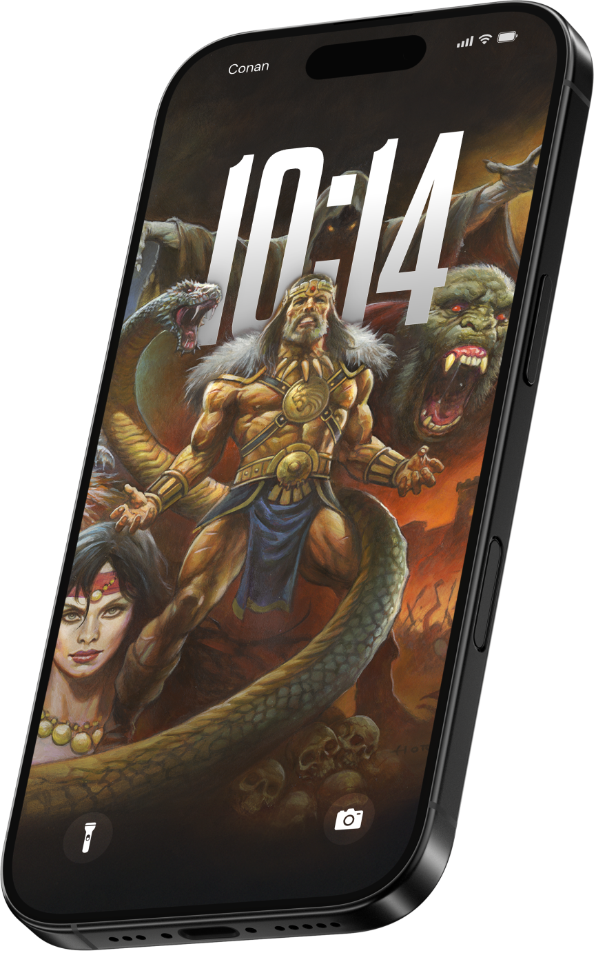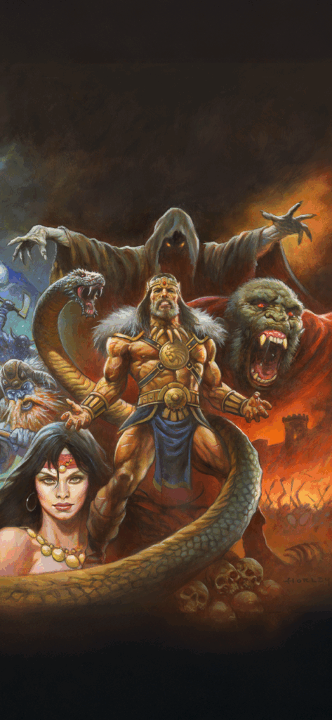 Steel meets sorcery in a storm of fire and blood. A lone warrior stands defiant before the forces of darkness, muscles carved by war, eyes burning with the fury of the gods. Behind him rise serpents, beasts, and black-cloaked doom, as the world trembles beneath the clash of sword and shadow. This is Conan, unbowed, unbroken, eternal. Artwork by Alex Horley.