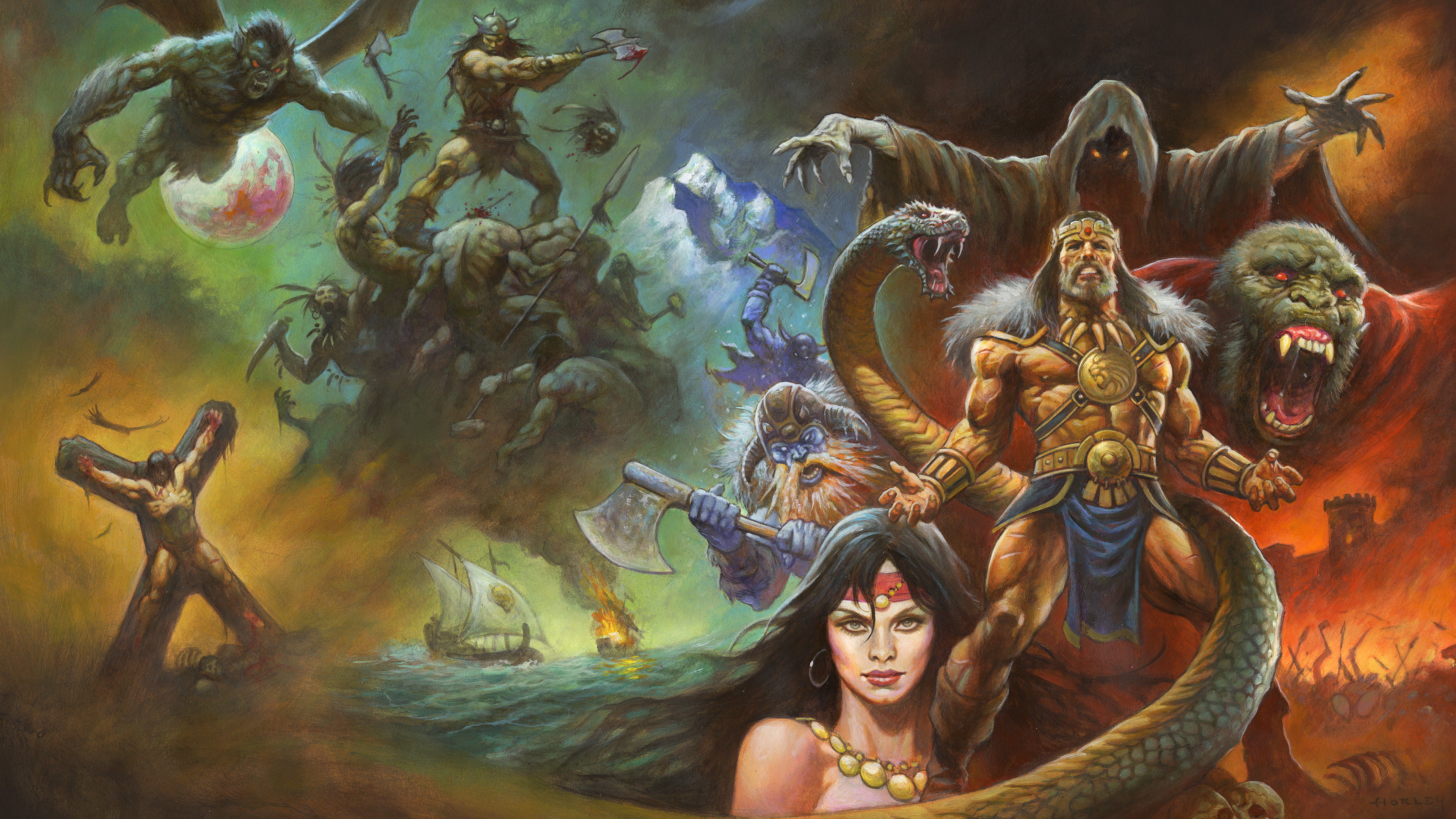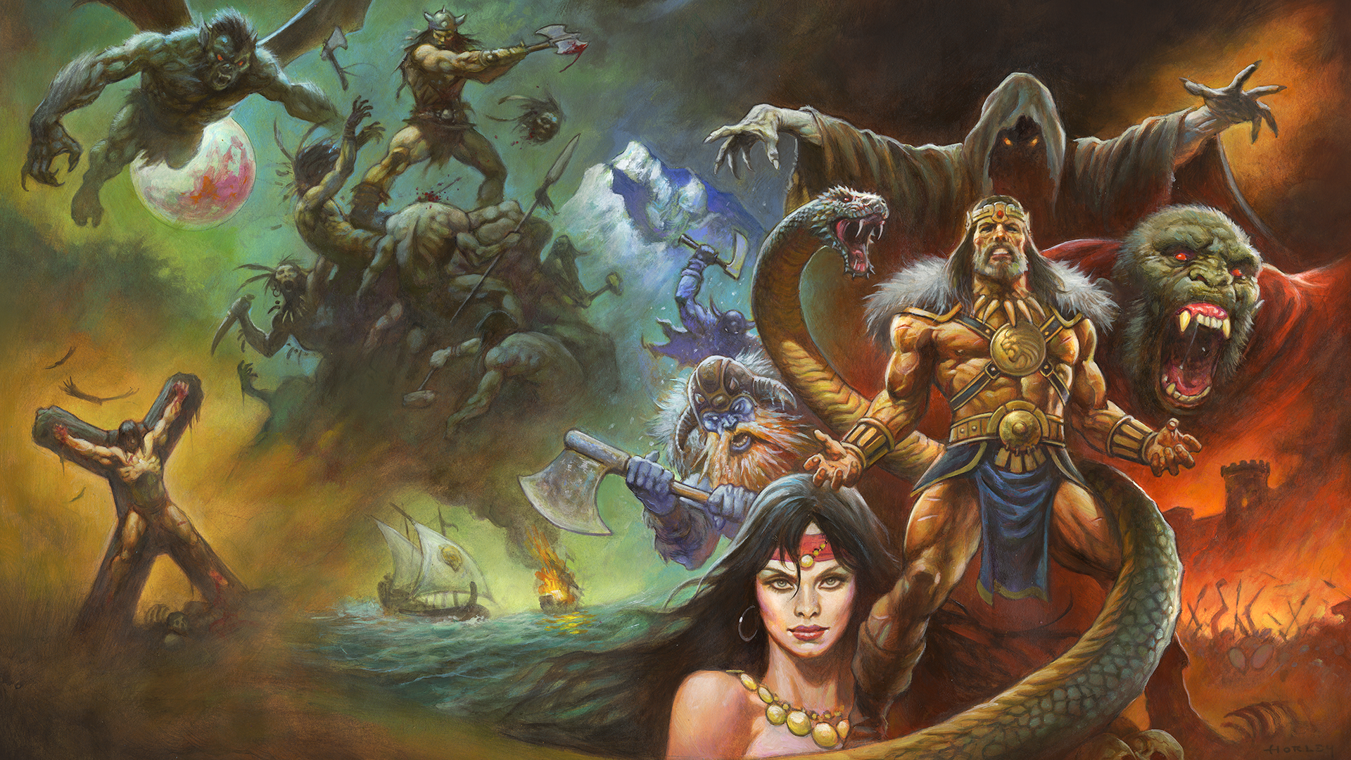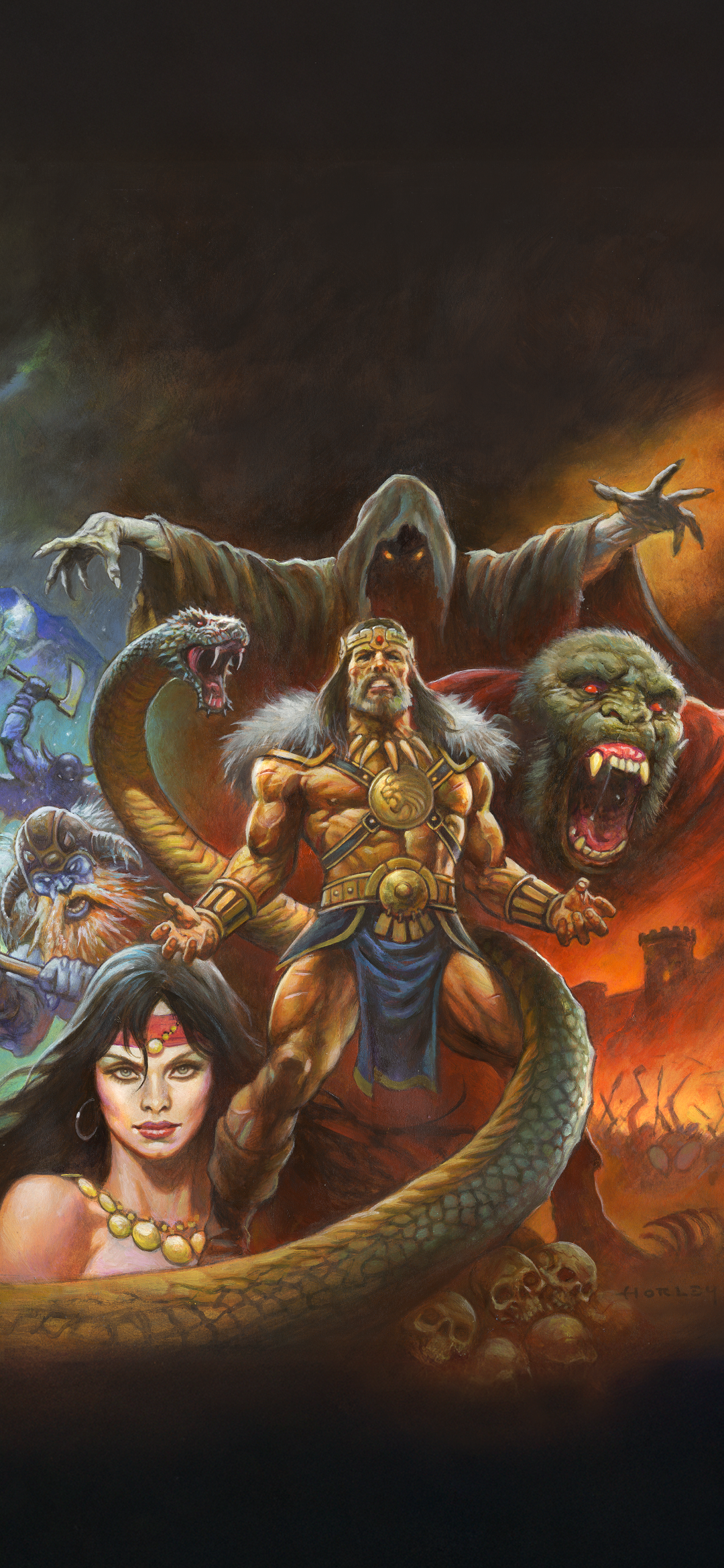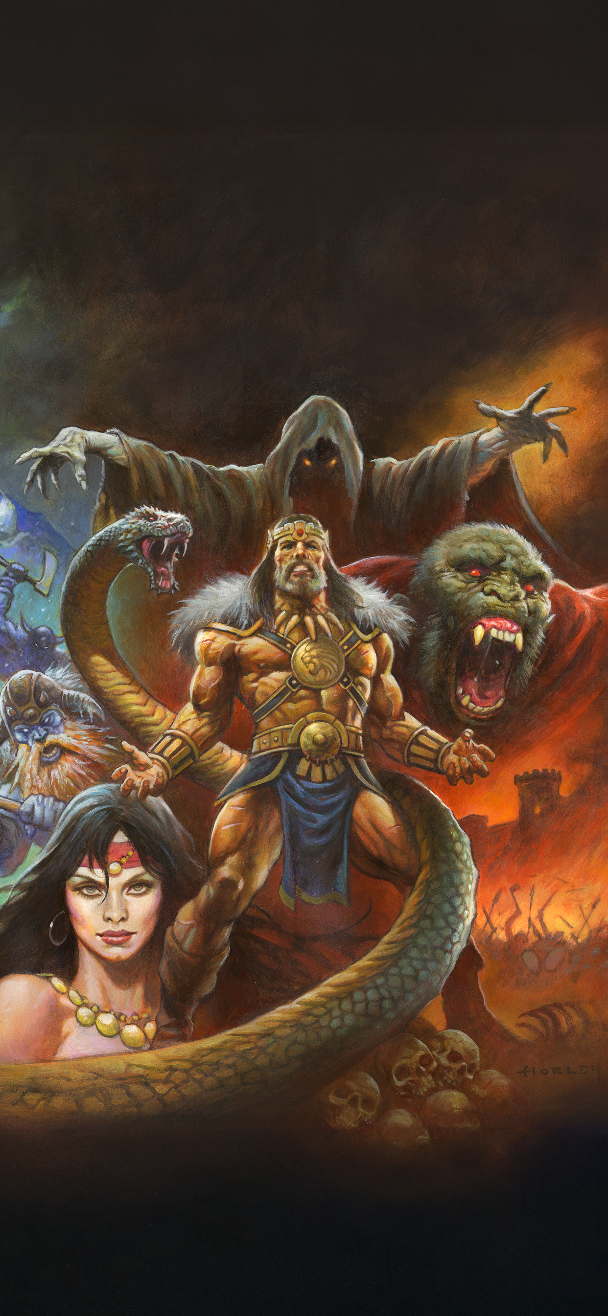 Steel meets sorcery in a storm of fire and blood. A lone warrior stands defiant before the forces of darkness, muscles carved by war, eyes burning with the fury of the gods. Behind him rise serpents, beasts, and black-cloaked doom, as the world trembles beneath the clash of sword and shadow. This is Conan, unbowed, unbroken, eternal. Artwork by Alex Horley.