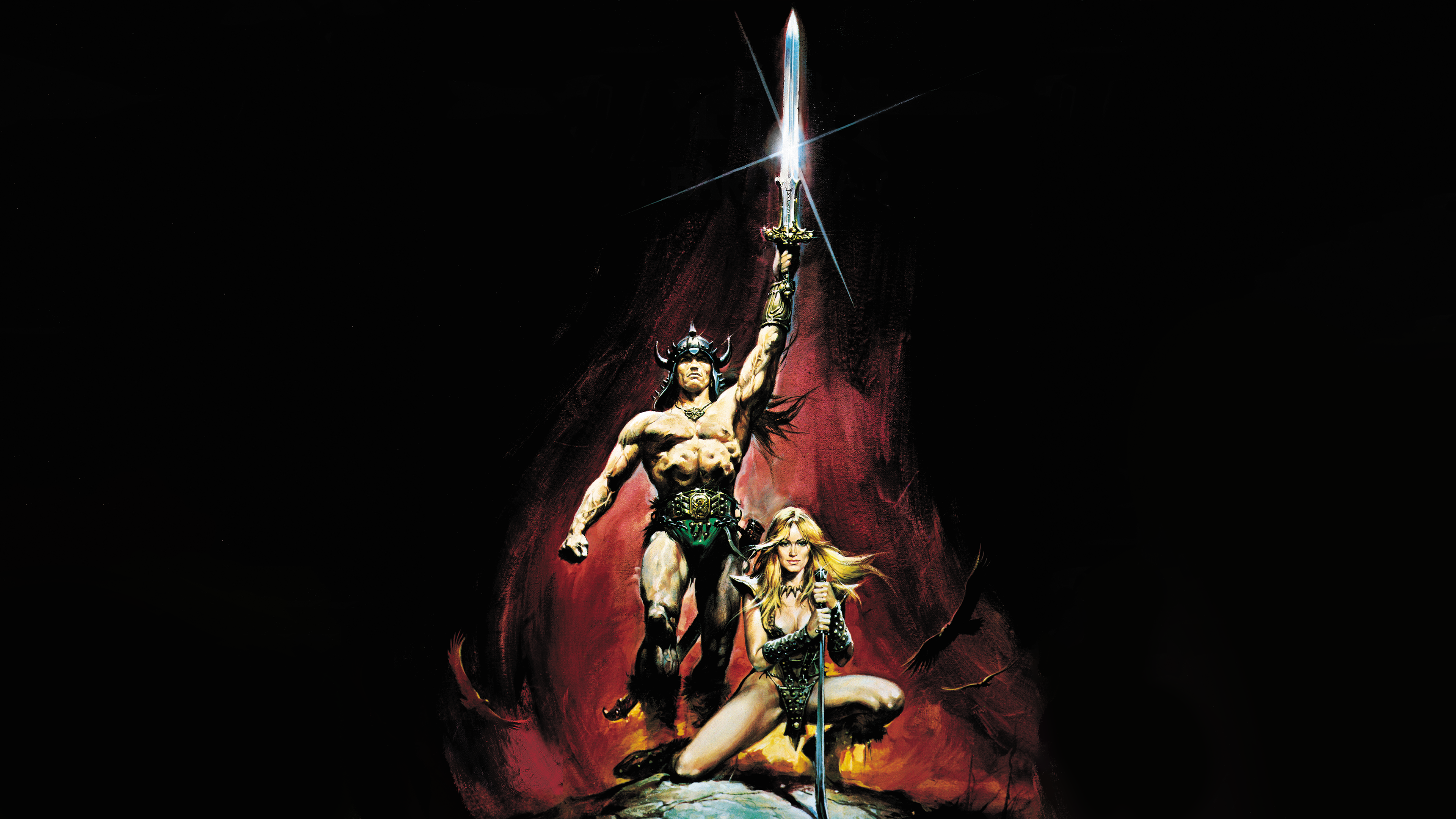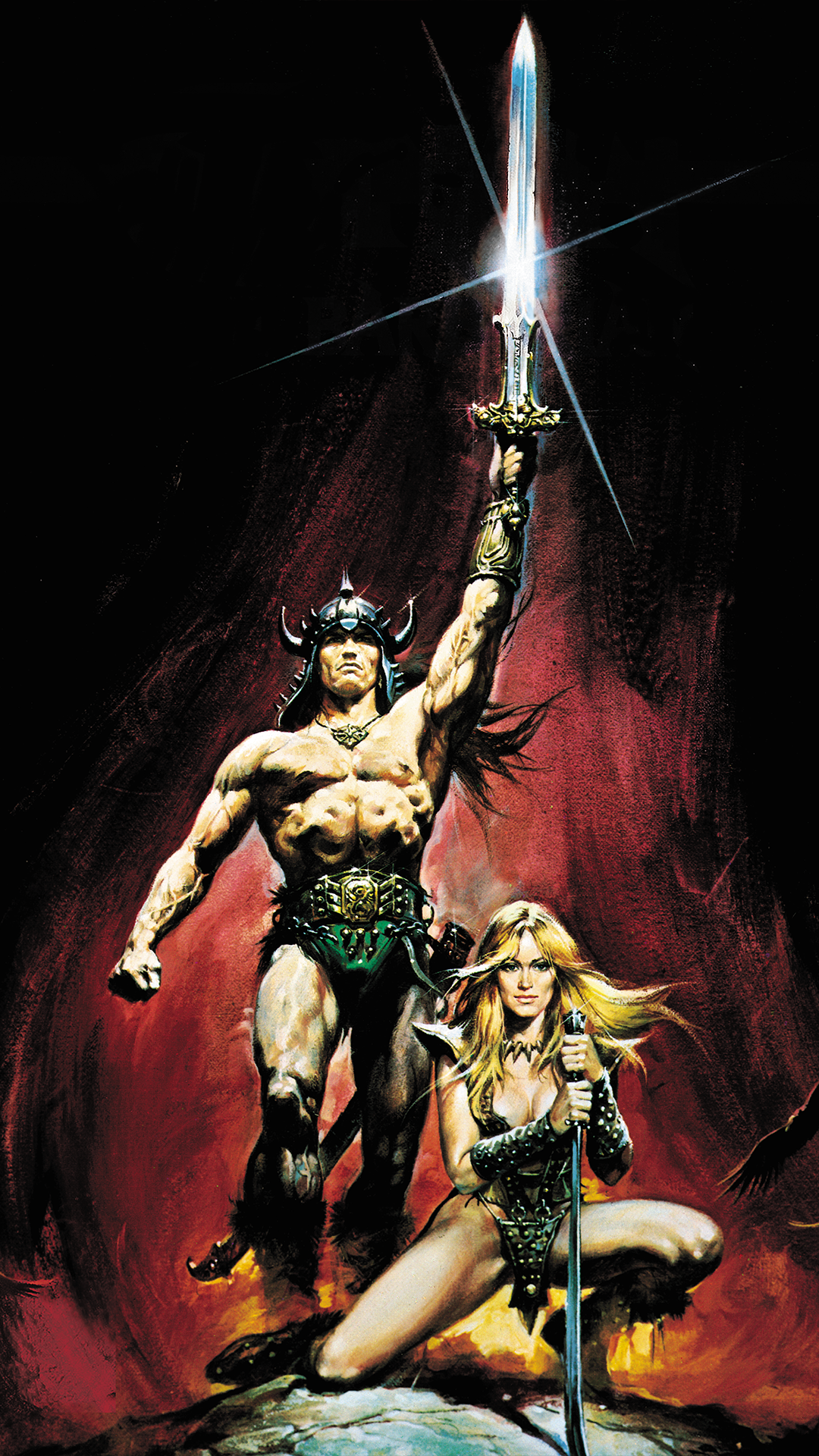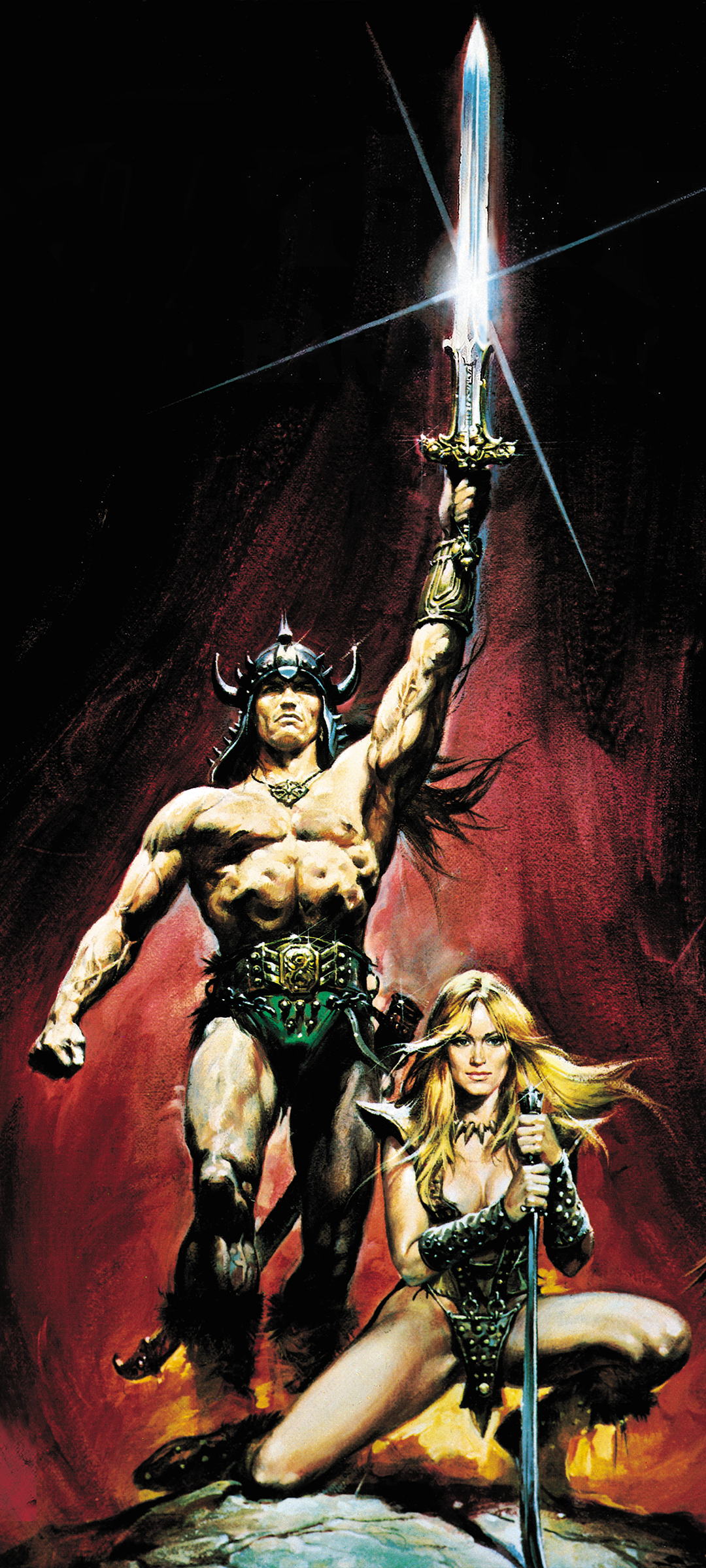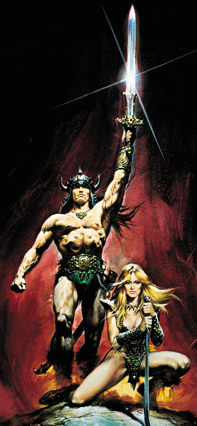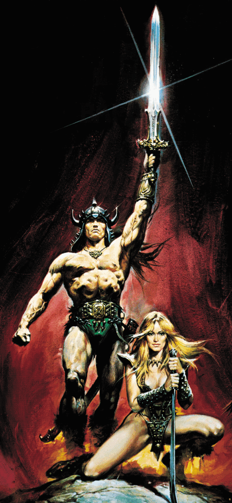 This poster from the mighty Conan the Barbarian (1982) film shows Conan standing triumphant, the Atlantean blade raised high like a challenge to the heavens. Beside him, Valeria, fierce and unwavering, a warrior bound by steel, loyalty, and fire. Drawn by the legendary Renato Casaro.
